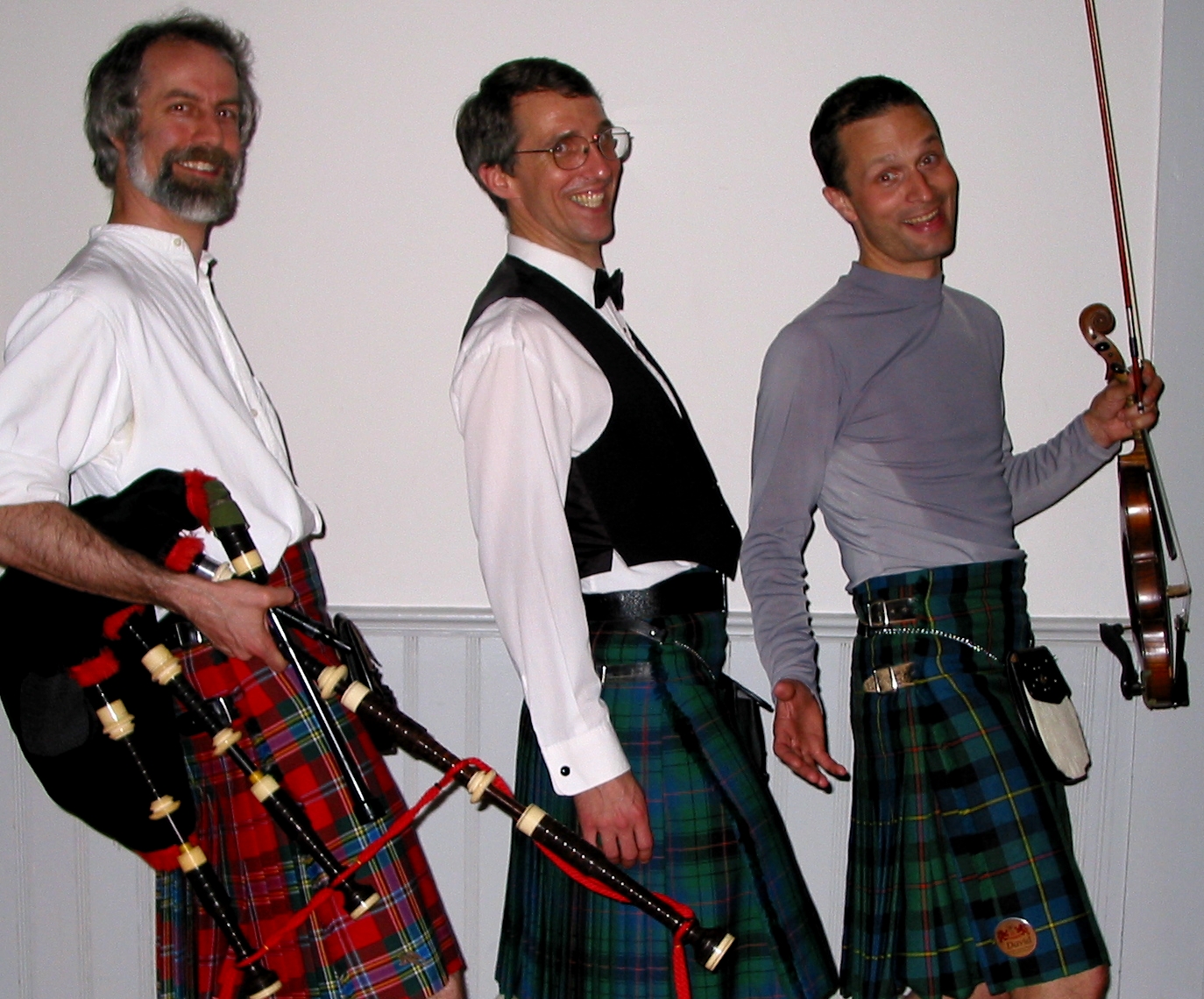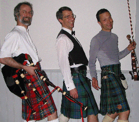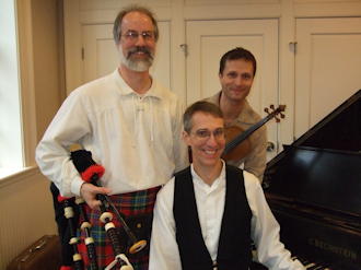 Thistle House is a Scottish dance band rewired for high voltage. Consisting of David Courret-Knight on fiddle, Dave Wiesler on piano, and Dan Emery on highland pipes, small pipes, and wooden flute, Thistle House is guaranteed to pump adrenaline into the most tired feet -- especially when the pipes start up! All three musicians are avid and accomplished Scottish country dancers as well as nationally recognized musicians, and this guarantees that the music they make will always be danceable and exciting.. | |